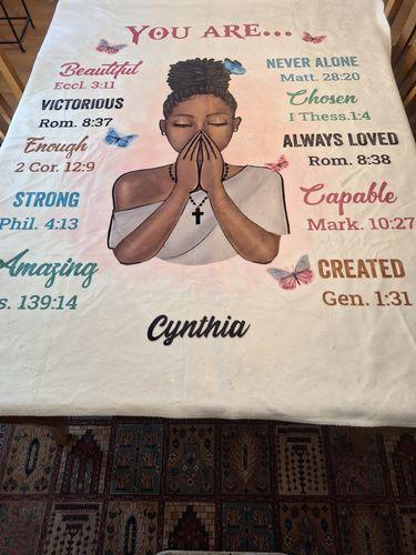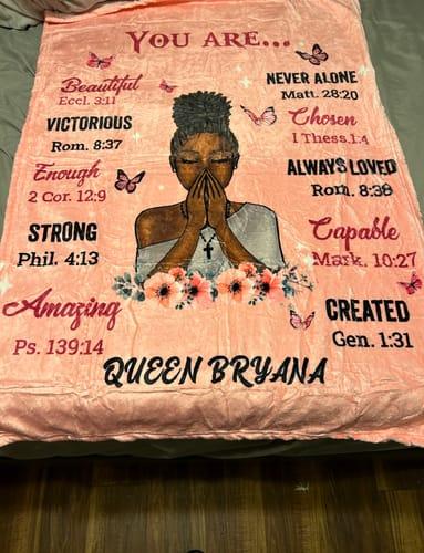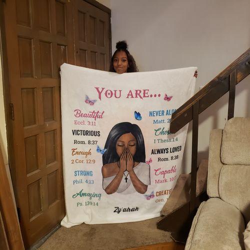 I love the blanket and my daughter love it as well it’s so cute and uplifting and the bible verses are a plus and i emailed and asked can they change my color to pink and they did i was so happy thanks so much will be ordering again !
